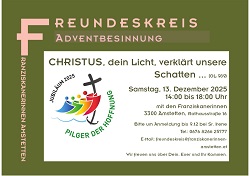 Am 13.12.2025 treffen wir uns zur Adventbesinnung im Kloster Amstetten. Gemeinsam mit den Freundinnen und Freunden der Franziskanerinnen Amstetten wollen wir uns Zeit nehmen für Besinnung und Austausch.