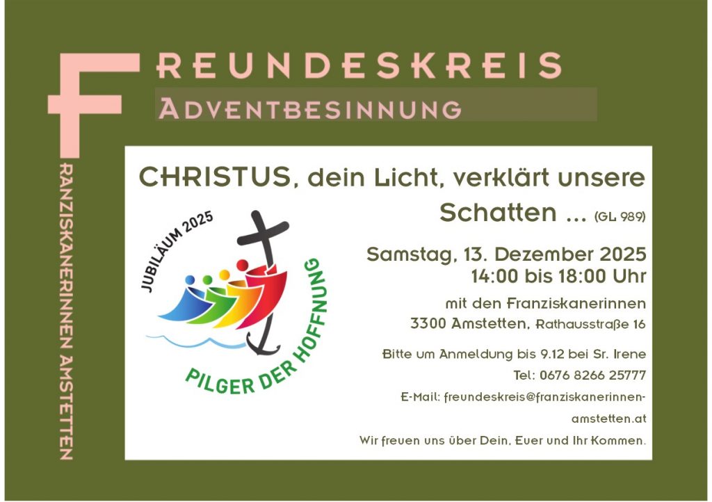13.12.2025: Adventbesinnung mit dem Freundeskreis der FranziskanerinnenVon Franziska Bruckner / 2 Dezember, 2025 Herzliche Einladung zu unserem gemeinsamen Weg durch den Advent.