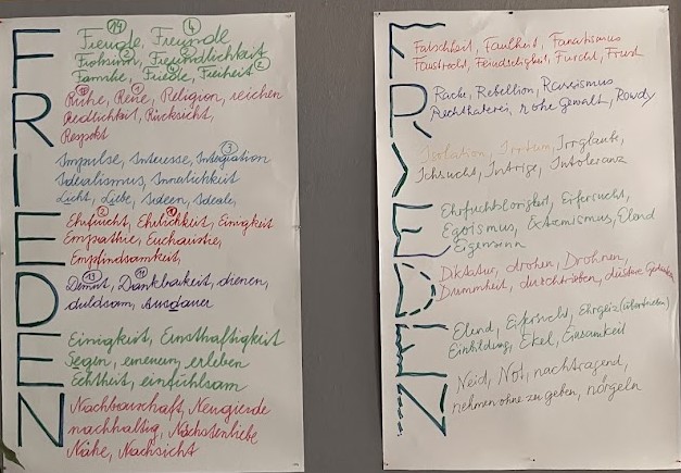 In einer meditativ kreativen Phase sammelten wir auf einfachen Mandelas „Futter“ für den guten Wolf: Vertrauen, Freude, Frieden, Hoffnung, Gelassenheit, Großzügigkeit, Dankbarkeit, Geduld, Wahrheit,…